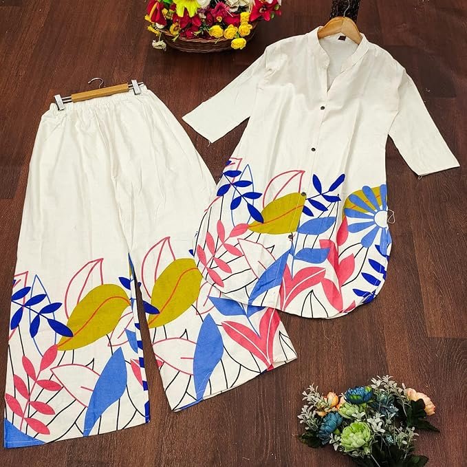 Upgrade your wardrobe with the ANAGH APPARELS Women’s Cream Cotton Printed Co-ord Set. This stunning ensemble is designed for women who value a perfect balance between comfort and style. The soft cream cotton fabric, embellished with multicolor leaf patterns, exudes elegance while offering a breathable and lightweight feel, making it ideal for everyday wear or casual outings.
