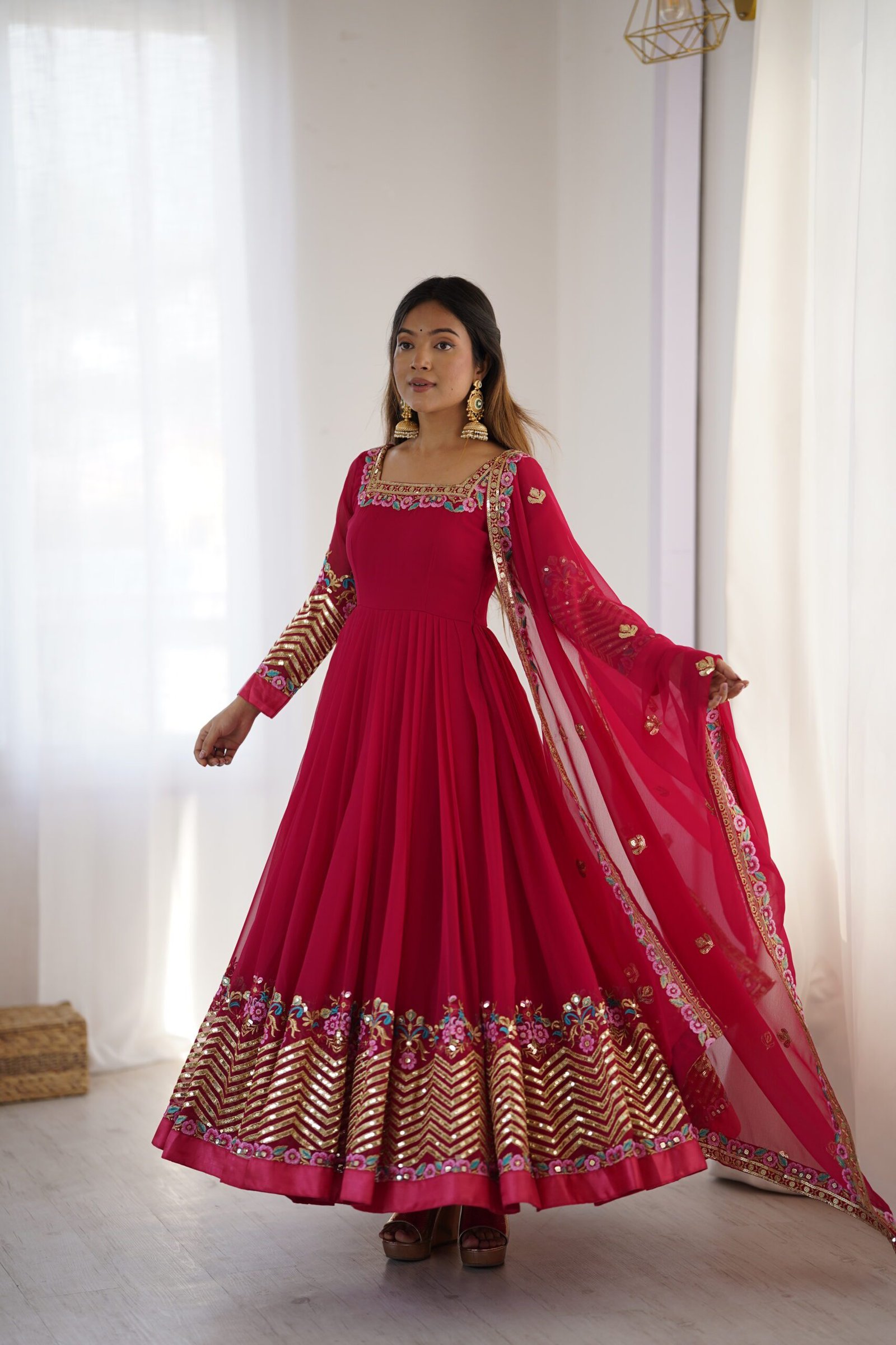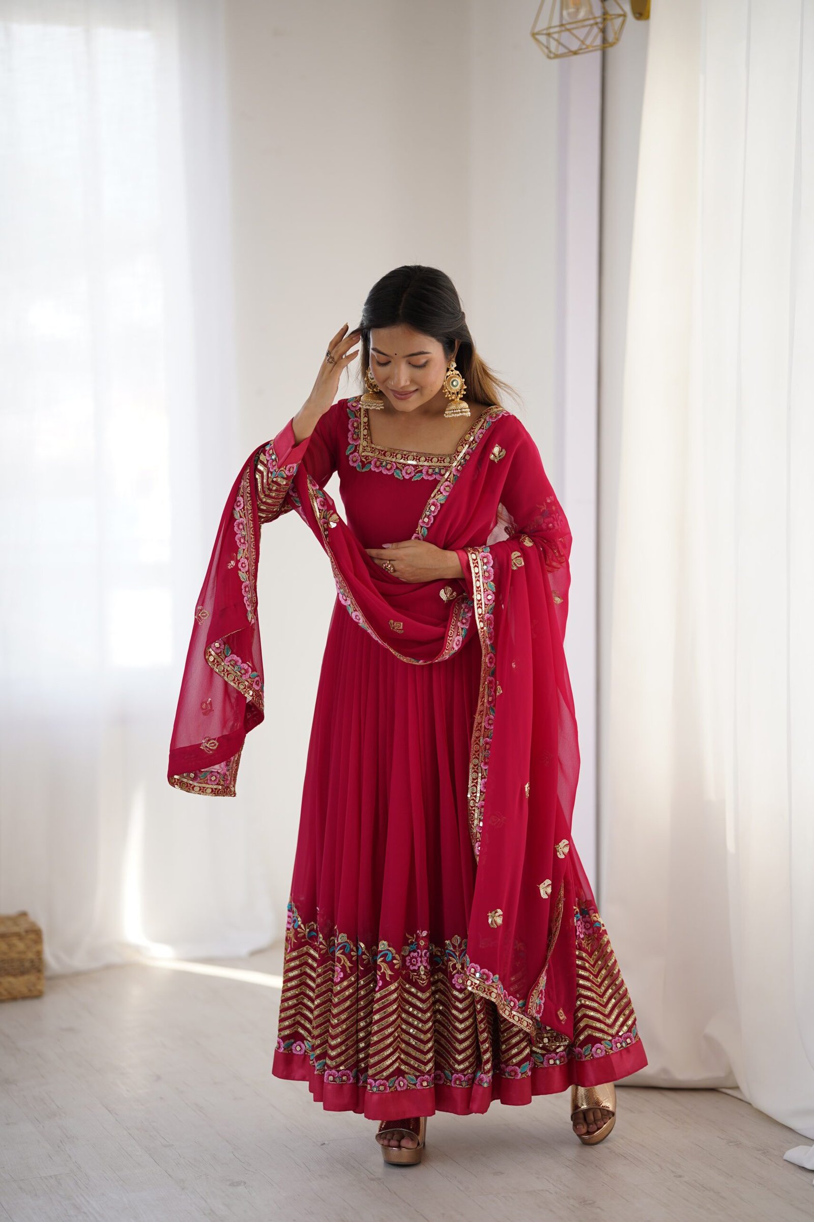 Elegant Embroidered Sequence Designer Anarkali Three Piece Set (Rani Pink)