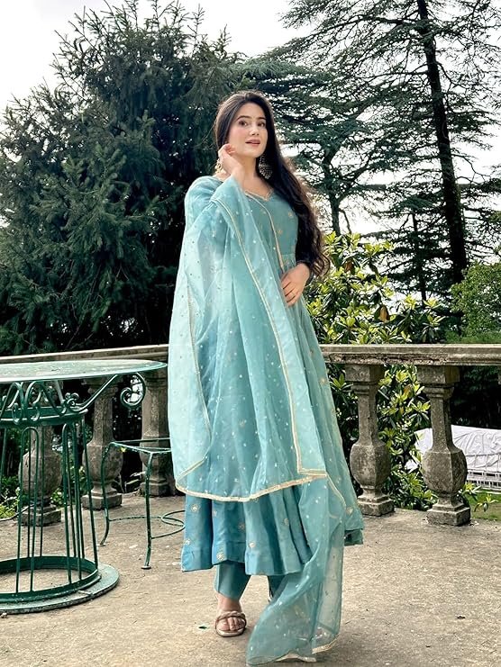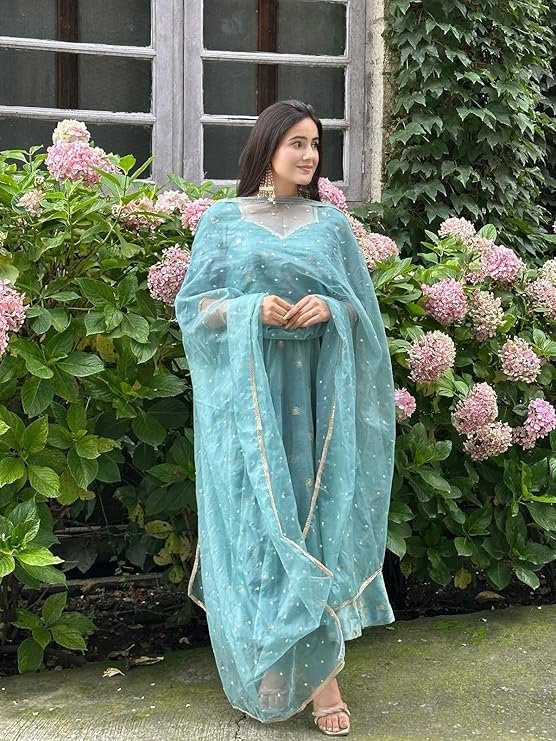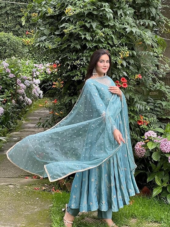 Not just an aesthetic marvel, this gown is designed with practical details to ensure maximum comfort throughout the day or night. The lightweight Vichitra Silk fabric allows for easy movement, making it ideal for long events. Whether paired with statement jewelry for a grand occasion or styled minimally for more intimate gatherings, this ensemble adapts effortlessly to your personal style preferences. Its universal appeal ensures that it suits a variety of occasions, providing you with unmatched versatility in your wardrobe.