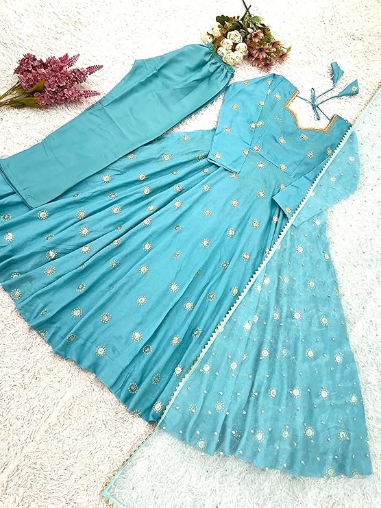 Reimagine your fashion journey with this Elegant Vichitra Silk Gown Set for Women. Get ready to leave a lasting impression with the combination of heavy embroidery work and a perfectly coordinated dupatta. Discover the beauty of flawless design and exceptional comfort in a single package.