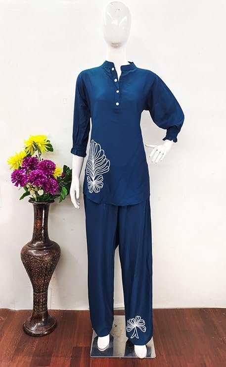 Crafted from premium-quality rayon fabric, this coord set is lightweight, breathable, and perfect for all-day wear. The enchanting blue hue adds a refreshing pop of color to your wardrobe, while the intricate embroidery work beautifully enhances the overall appeal. Whether you’re attending a casual gathering, heading to work, or stepping out for a brunch date, this outfit effortlessly suits every setting.